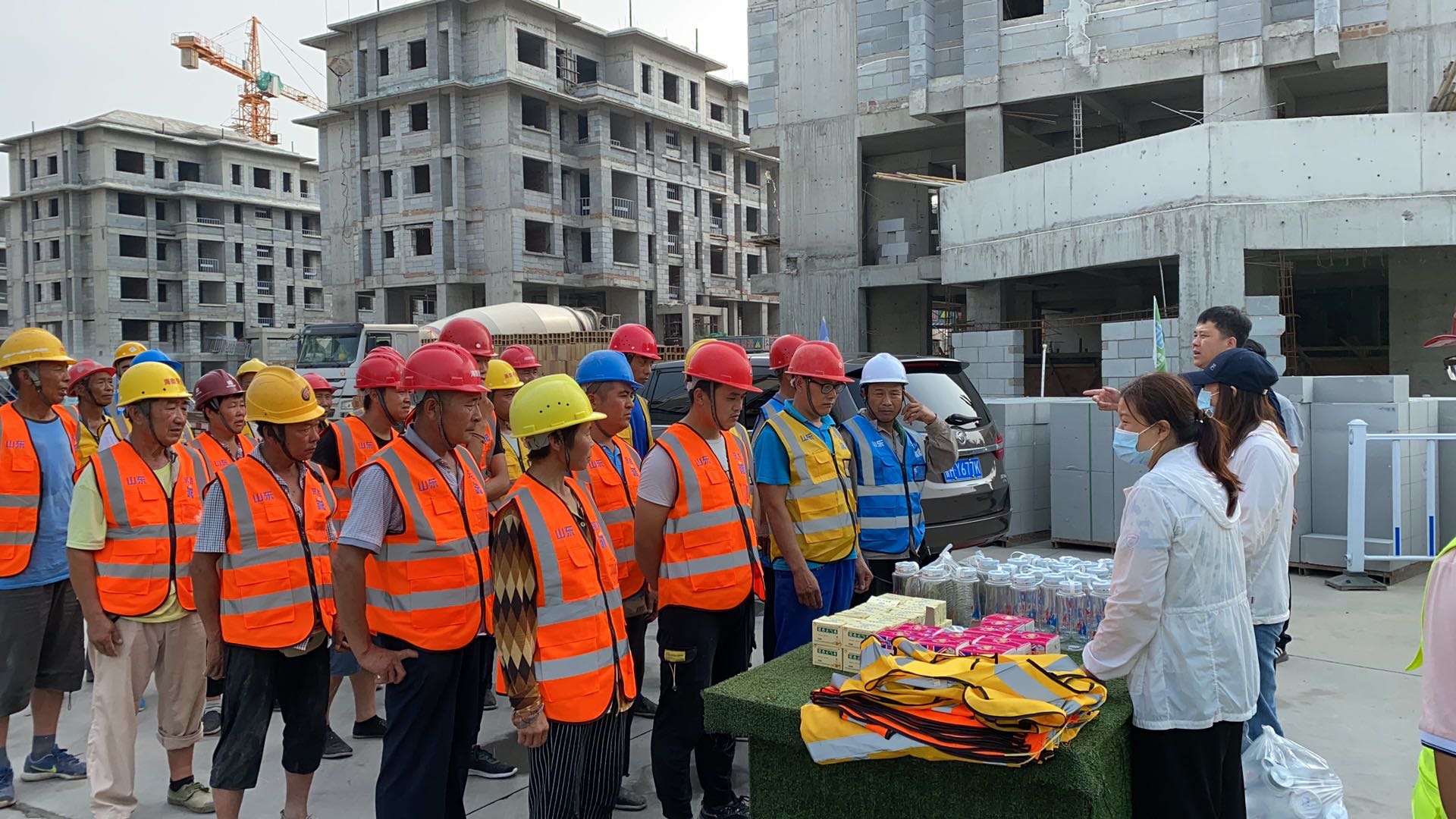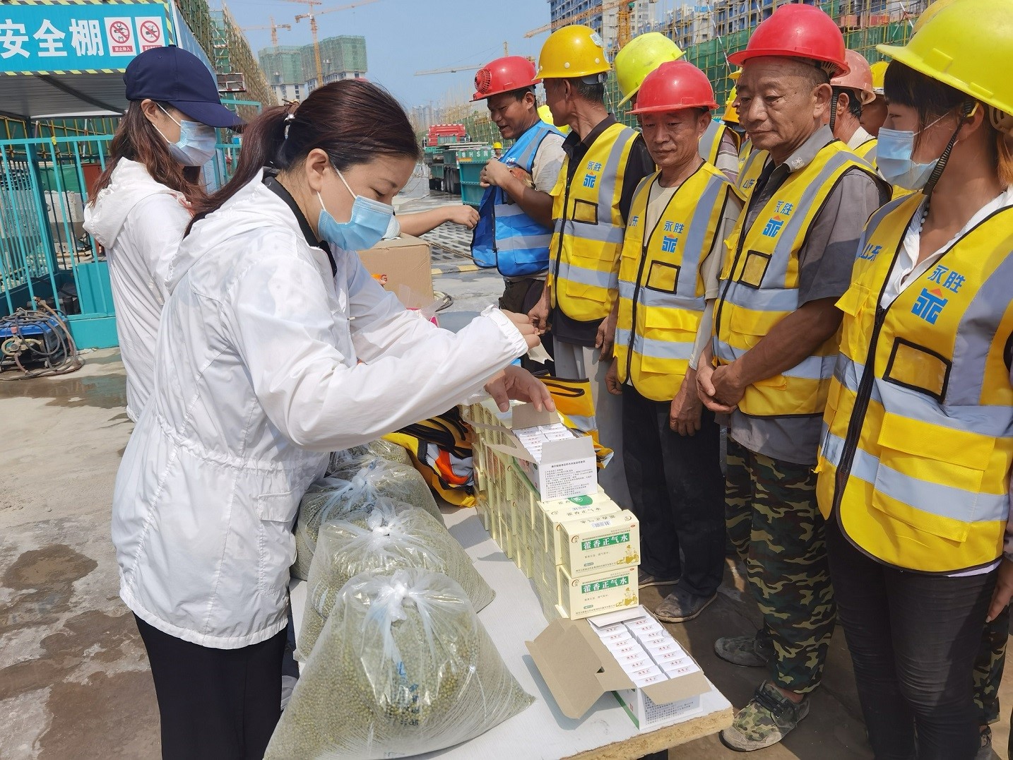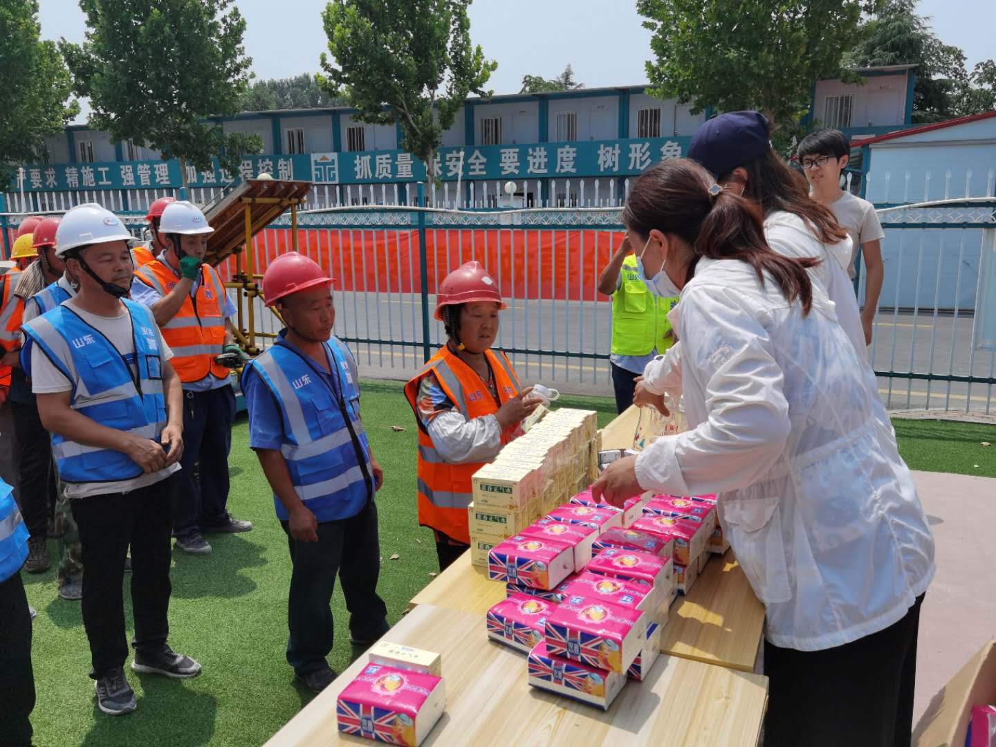夏日里驕陽似火、酷熱難耐,烈日灼燒的工地上,建設(shè)者們埋頭苦干、揮汗如雨,用辛勤的汗水譜寫著酷暑下熱火朝天的動人畫面。7月8日,集團(tuán)辦公室、施工管理部代表集團(tuán)公司高管層、工會,深入天繪商業(yè)街、京投SOHO、柳行幼兒園、海達(dá)會展中心、紫麟府二期、兗州瑞馬等施工現(xiàn)場,為工人們送去了綠豆、水杯、風(fēng)油精、藿香正氣水、紙巾等消暑物品,并叮囑工人們保重身體,做好防暑降溫工作,確保安全生產(chǎn),真正把清涼送到了施工現(xiàn)場,把關(guān)懷送進(jìn)了工人心坎。