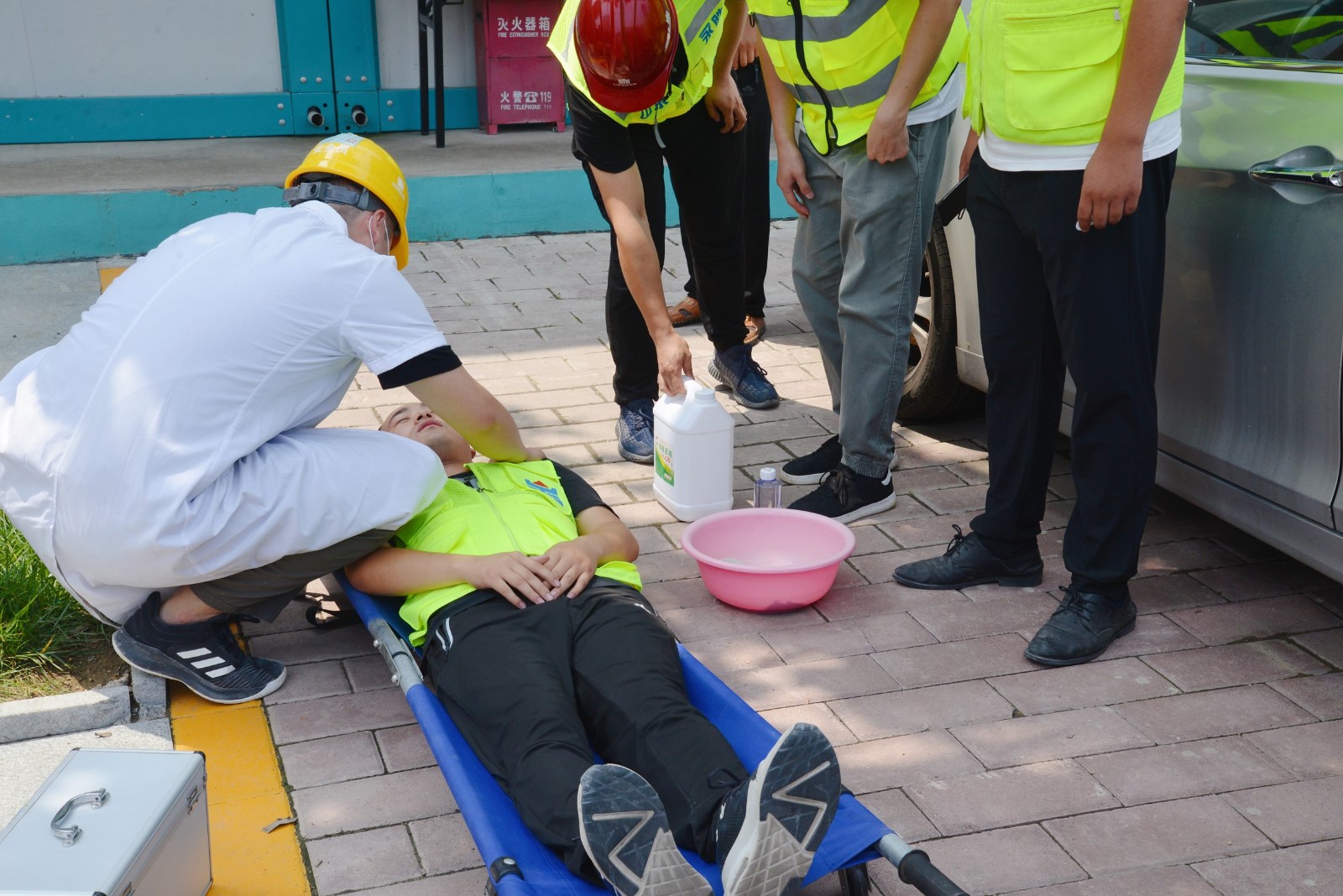 培訓(xùn)會(huì)后,現(xiàn)場(chǎng)組織了高溫中暑應(yīng)急演練。中午12時(shí),隨著“報(bào)告,發(fā)現(xiàn)一名員工中暑暈倒”的一聲呼叫,演練正式開始。保管員發(fā)現(xiàn)人員倒地,初步判斷倒地者出現(xiàn)了中暑癥狀,立即向班組長(zhǎng)匯報(bào)了現(xiàn)場(chǎng)情況并通知安全員。應(yīng)急小組立即帶上急救藥箱、毛巾奔赴現(xiàn)場(chǎng),迅速判斷病情,開始急救:搬移→降溫→補(bǔ)水→促醒→送醫(yī),每個(gè)步驟都有條不紊,演練達(dá)到了預(yù)期效果,取得了圓滿成功,獲得了現(xiàn)場(chǎng)人員的一致好評(píng)。